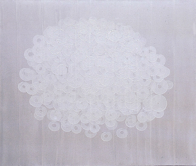 The nearly translucent circles are still, suggesting suspended motion. The floating sensation of the ‘O’ shapes gently balances the movement in the repeating swirls of paint. Each regulated mark of the artist’s brush is a meditative gesture. Each represents a moment in space and can be seen as both personal and cosmological.